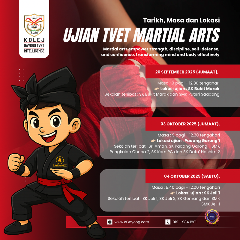 | PRA AWAN PUTIH (GAYONGKIDZ TAHAP 1) | RM85.00 | 📌 Yuran Ujian Pra Awan Putih – RM85.00 meliputi semua kos : ✔️ Pengurusan & rekod ujian (eGayong IMS) ✔️ Bayaran penguji & jurulatih rasmi ✔️ eSijil rasmi TVET Martial Arts ✔️ Kenaikan tali pinggang/bengkong ✔️ Logistik & fasiliti ujian |