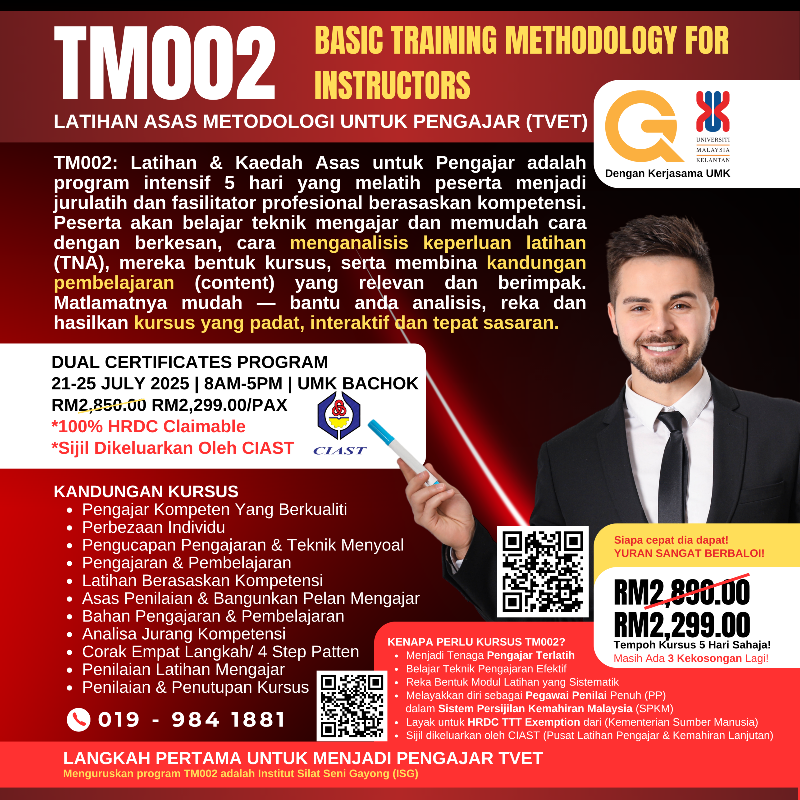 | TM002 : 3 KEKOSONGAN. Basic Training Methodology for Instructors | RM2299.00 | Masih ada 3 kekosongan. Tujuan Kursus TM002 selama 5 hari sahaja termasuk Sijil TM002 yang dikeluarkan oleh pihak CIAST |